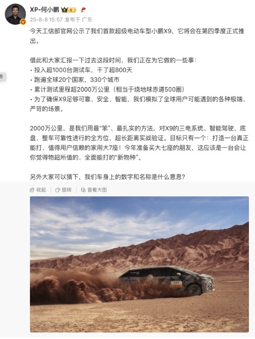8月8日下午,小鹏汽车董事长何小鹏在微博发文透露,今天工信部官网公示了小鹏首款超级电动车型小鹏X9,它将会在第四季度正式推出。